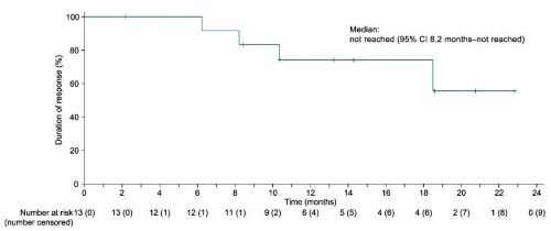中位DOR尚未达到,12个月的DOR率为74.1% (95% CI:39.1-90.9)。