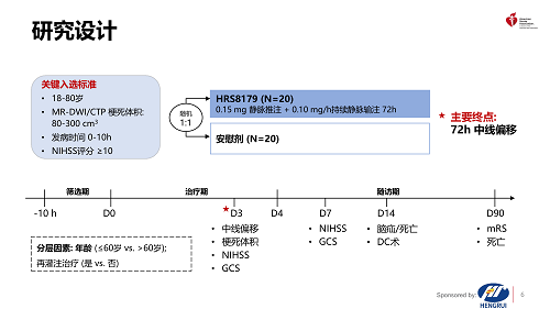 注射用HRS8179是由利来国际自主研发的创新药,是磺酰脲类受体1(SUR1)阻断剂,能够阻断SUR1/TRPM4离子通道,减少Na+内流,从而减轻LHI后继发的脑水肿、降低死亡率,改善神经功能4,5。HRS8179-201研究旨在评估HRS8179在LHI患者中的有效性和安全性。